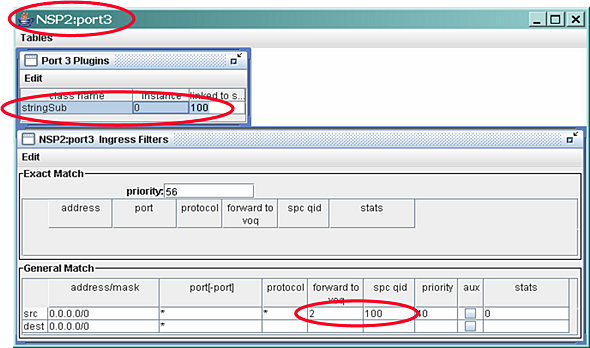 Fig. 2 shows that we have installed the stringSub plugin at ingress port 2.3 and bound it to a GM filter through SPC queue 100. Furthermore, after plugin processing, packets will be placed in VOQ 2 for forwarding to port 2 (the forward to voq entry).